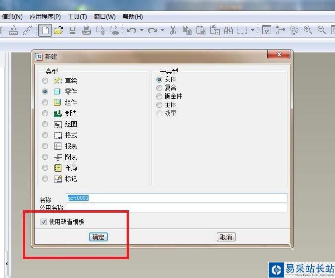 1、如下圖所示,打開(kāi)Pro/e5.0軟件,“使用缺省模板”新建一個(gè)實(shí)體零件文件。