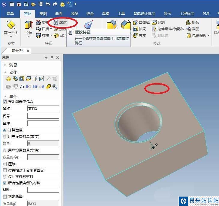 4、如下圖所示,選中實體,點擊特征工具欄中的“螺紋”圖標,激活該命令。