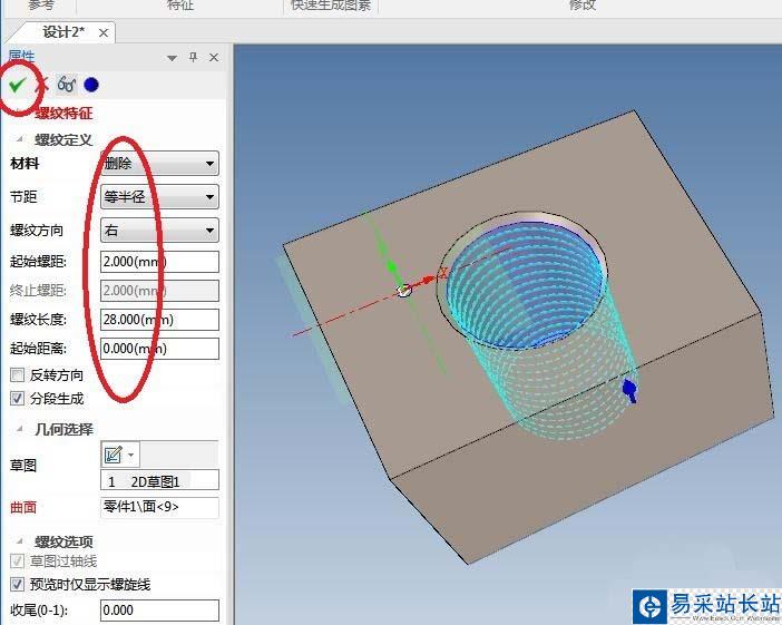 10、如下圖所示,退出草圖之后,在屬性欄中設置螺紋特征的參數:材料改成“刪除”,起始螺距:輸入2,其余可以采用默認,點擊“√”完成螺紋特征的創建。