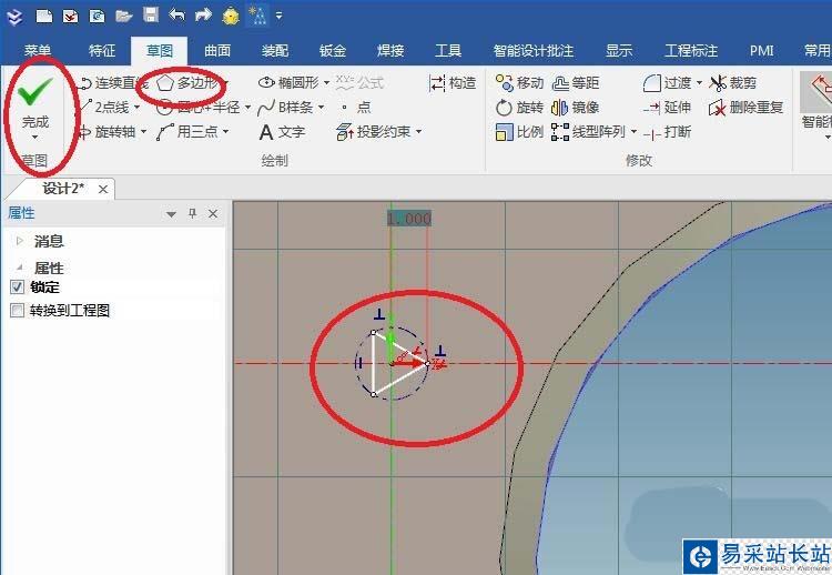 9、如下圖所示,進入到草圖環境,點擊工具欄中的“多邊形”圖標,點擊坐標原點,畫一個正三邊形,標注三角形尖部距離Y軸1,點擊“完成”。