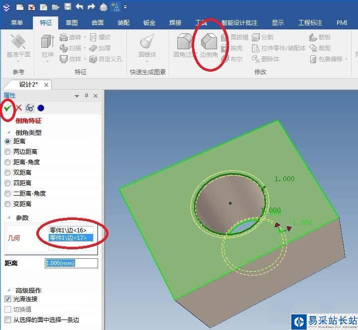3、如下圖所示,點擊特征工具欄中的“邊倒角”圖標,屬性欄設置距離為1,實體中選擇孔的兩頭邊線,“√”確定生成并退出。