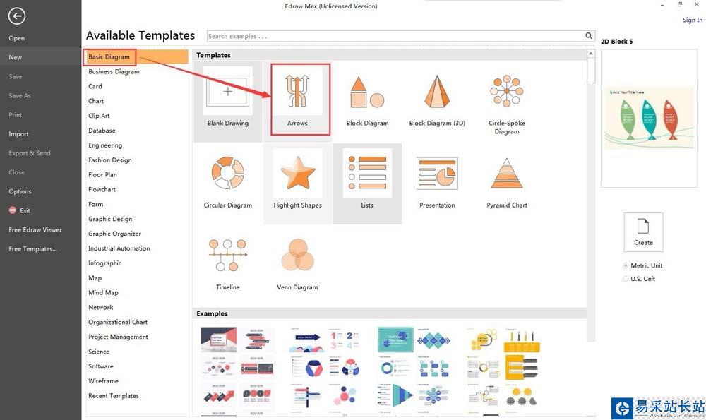 2、在基本圖形Basic Diagram中找到并雙擊Arrows箭頭;