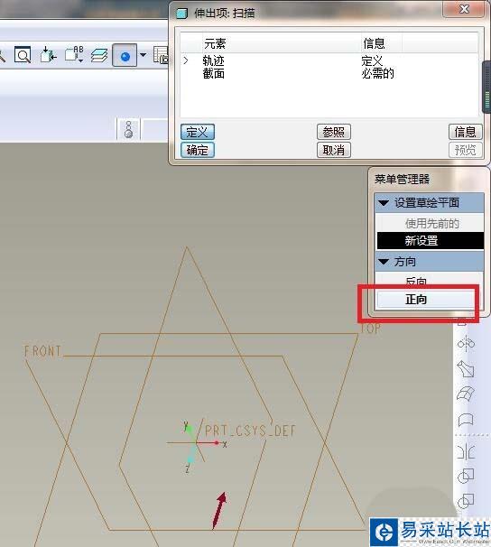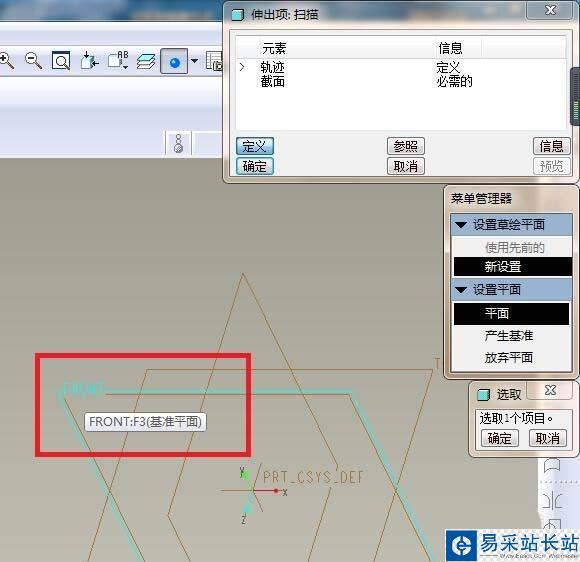 4、如下圖所示,菜單管理器點(diǎn)擊“FRONT面”為草繪平面,