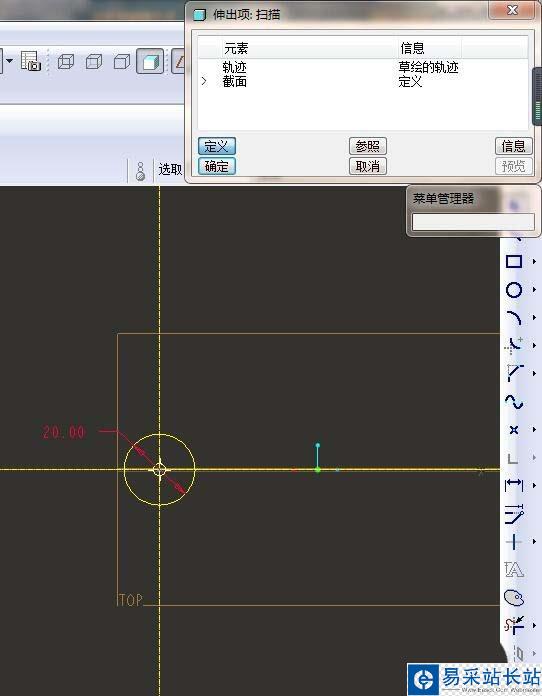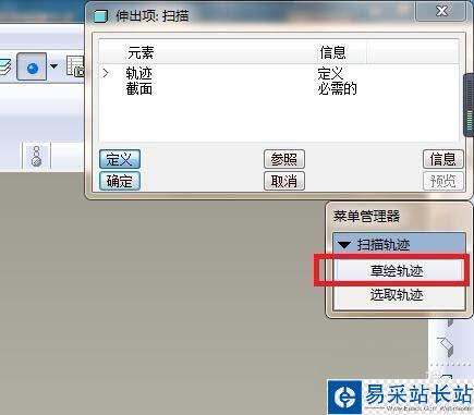 3、如下圖所示,菜單管理器中點(diǎn)擊“草繪軌跡”。