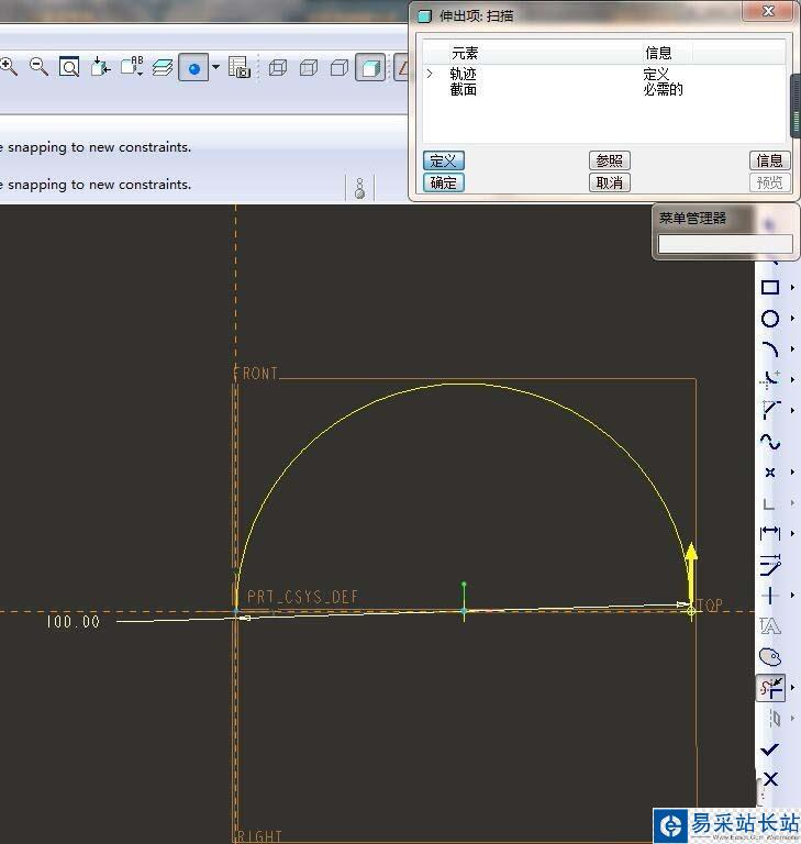 7、如下圖所示,進(jìn)入到草繪環(huán)境,這是畫掃描軌跡。激活“圓”命令,點(diǎn)擊,以橫軸上任一點(diǎn)為圓心畫圓與縱軸相切,標(biāo)注直徑100,激活“裁剪”命令,裁剪成半圓,點(diǎn)擊“√”,完成并退出本次草繪。