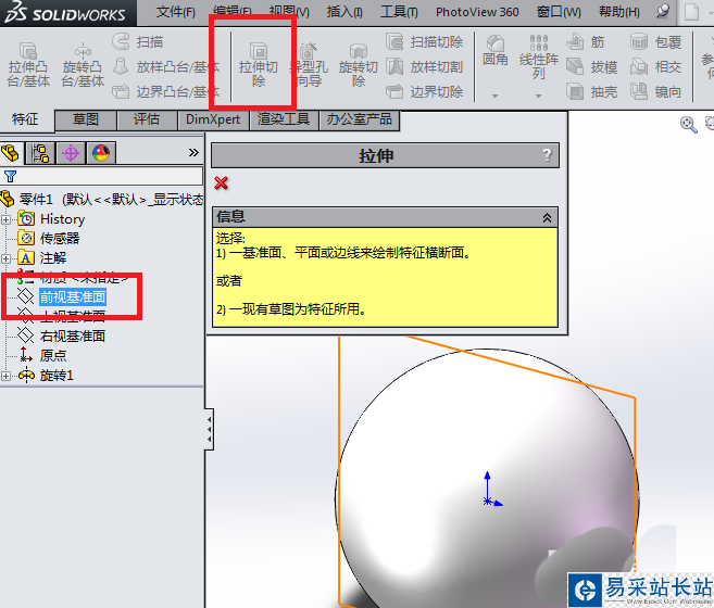 5、如下圖所示,點擊工具欄中的“拉伸切除”圖標,激活該命令,點擊設計樹中的“前視基準面”為草圖平面。