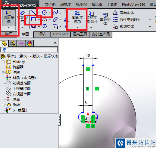6、如下圖所示,又一次進入到草圖環境,畫一個下圖中的草圖,最后別忘了“退出草圖”就行。這一步主要用到的命令依次是:矩形、圓、裁剪實體、智能尺寸。