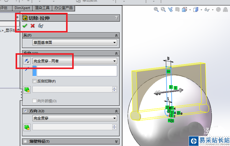 7、如下圖所示,退出草圖之后,來到“切除-拉伸”對話框,設置拉伸方式為“完全貫穿-兩者”,然后打“√”就行了。至此,鈴鐺的“口”就開好了。