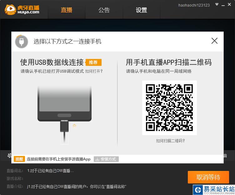 4、進入直播間后,系統會彈出連接手機的兩種方式提示。若此時已打開手游直播app則展示未連接的提示