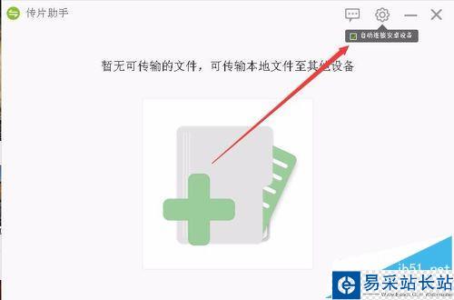 8、這時會打開傳片助手窗口,點擊右上角的設置按鈕,在彈出菜單中去掉“自動連接安卓設備”前的勾選