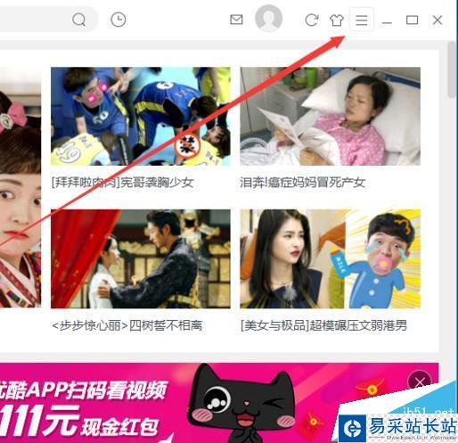 2、在打開的優酷視頻窗口,點擊窗口右上角的“三橫-菜單”選項圖標按鈕。如圖所示;