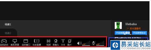6、圖中紅框標記的是你所需要直播的源,既直播游戲,窗口,文字圖片,或者是整個屏幕。根據你所需要的直播內容來確定。最后不要忘記了,點擊圖中藍框標記的開始直播。