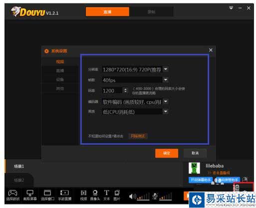 5、圖中紅框所標記的能打開設置,在設置里(既藍框所標記處)可以確定你的直播畫面清晰度,流暢度,以及分辨率等。這些根據你的網速,及機器的配置來好好設置吧,如果不了解,直接點擊網絡測速,系統會自己幫你選擇。