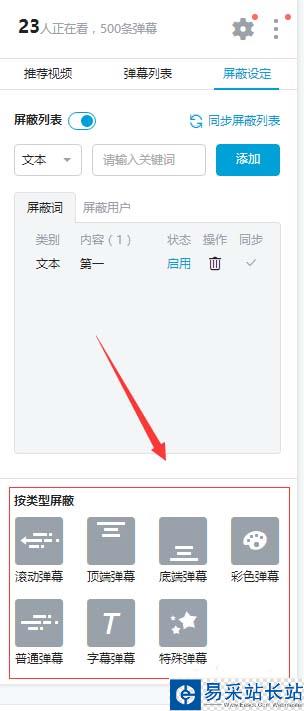 5、在屏蔽設定的底端我們可以看到有個按彈幕類型屏蔽的設定,例如對于一些遮擋字母的彈幕也可以屏蔽掉