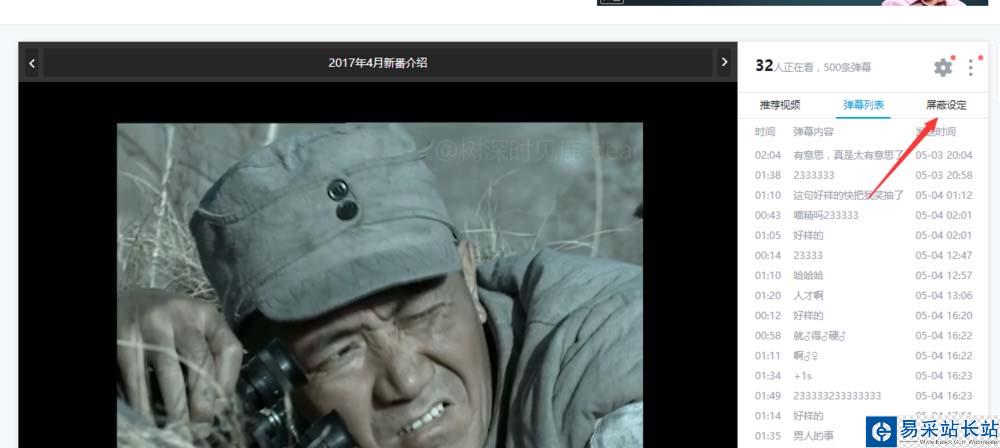 2、打開視頻播放頁面后,我們點擊播放窗口右邊的屏蔽設定,如圖所示