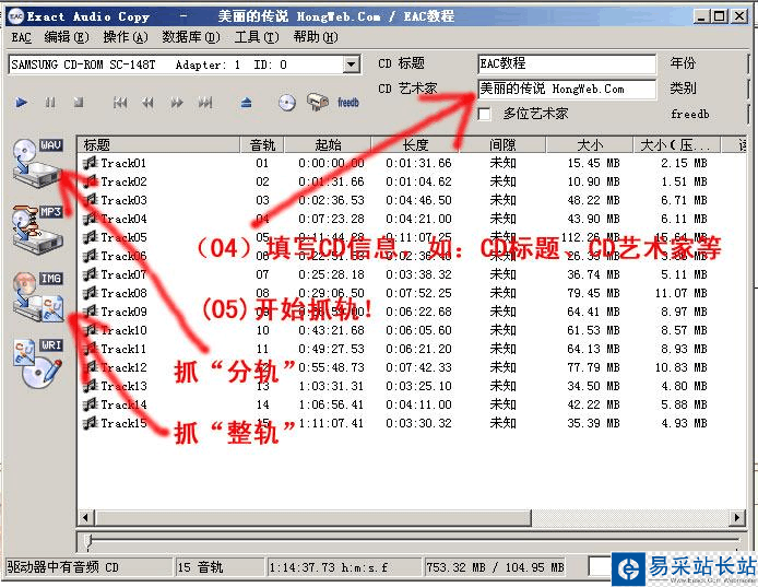 注解:整軌方式要比分軌方式好,抓成整軌,隨時可以利用CUE列表,生成分軌歌曲文件,同時在刻錄CD的時候,整軌方式保留的原CD光盤歌曲之間的間隙(原滋原味);所以建議大家抓軌的時候抓成整軌。