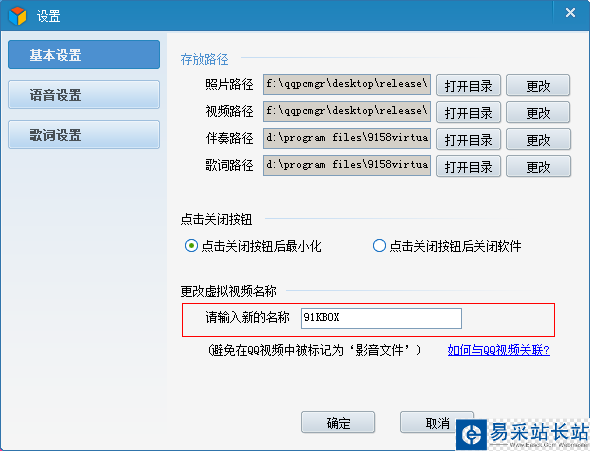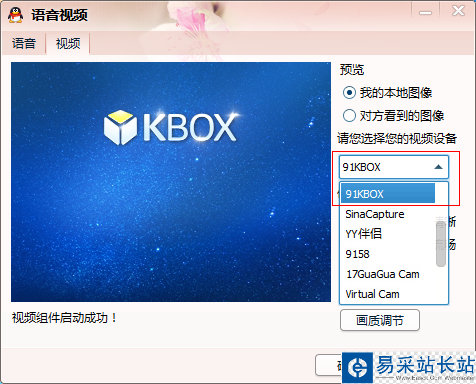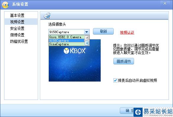 若想在網上視頻的時候開啟KBOX,需進行相應的軟件關聯。原則就是找到您視頻聊天或視頻游戲等軟件的視頻設置,把軟件上的攝像頭選擇為KBOX的名字即可。KBOX的名字可以在菜單中的設置中(如下圖)