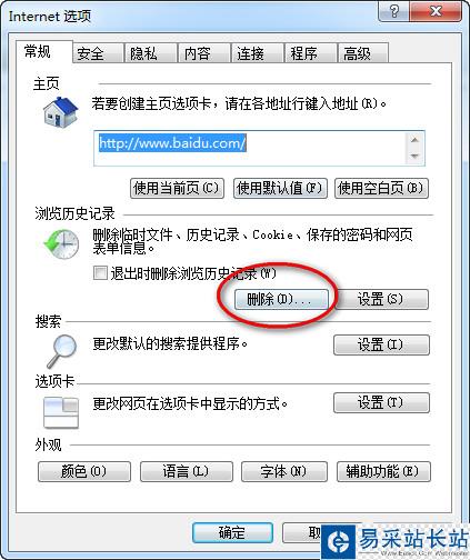在 Internet 選項設置窗口中點擊“刪除”按鈕