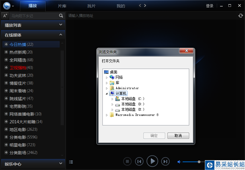 5、選擇打開文件夾,會彈出瀏覽文件夾,你可以打開本地保存的視頻文件