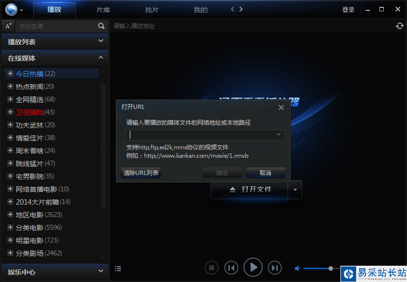 4、選擇打開URL,提示,輸入要播放的媒體文件的網絡地址或本地路徑