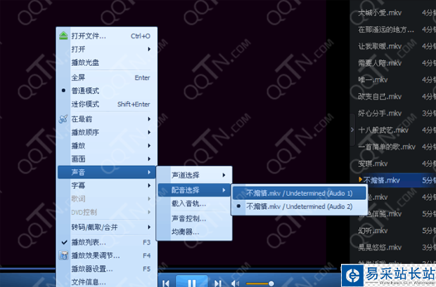 4、使用QQ影音或暴風影音播放,播放的時候是原聲,請右鍵->聲音->配音選擇->選擇另一個。
