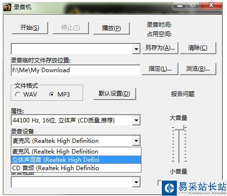 第五步:這里可以設置錄音文件的保存路徑、格式、屬性,錄音設備中選擇立體聲混音,錄音控制的話選主音量 ,路選主音量,不勾選選中/靜音,這里還可以調節錄音的音量一般拉到最高就可以了,設置好以后關閉窗口即可