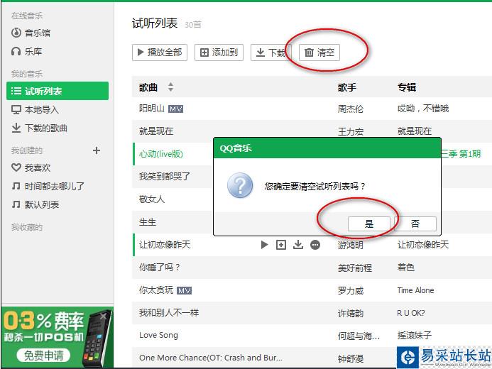 2、我們可以看到試聽列表中有一個"清空"按鈕,點擊一下就可以清空了。在彈出的對話框中選擇“是”