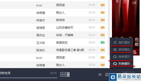 2、我們可以看到它的播放方式有四種單曲循環、隨機播放、順序播放、列表循環,大家可以選擇你想要的播放方式