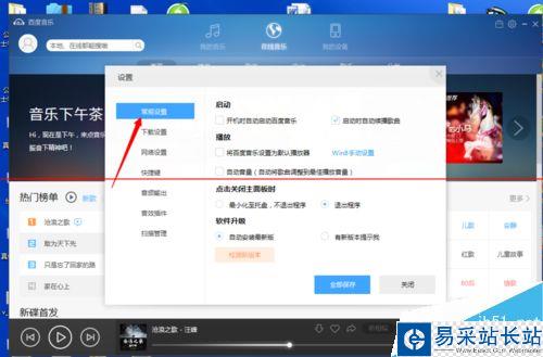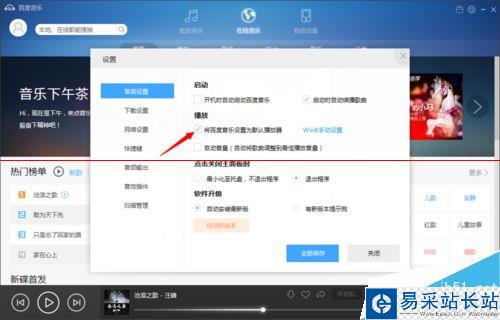 4、在”常規設置“項目下,有一個”播放“項,其中第一個就是”將百度音樂設置為默認播放器“,現在前面的方框內是空白的。在方框內打上勾。