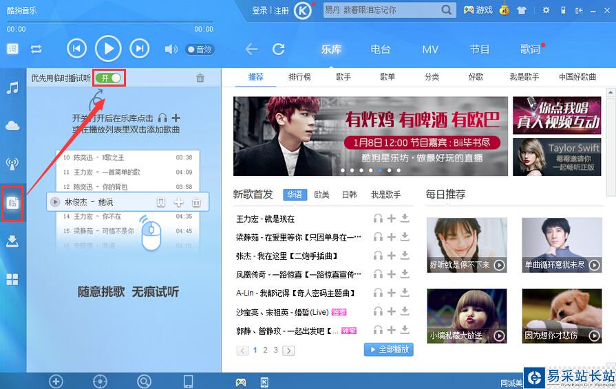 酷狗音樂最新版新增了臨時播功能,優(yōu)先用臨時播試聽功能開啟后在播放歌曲時就可以隨意挑歌無痕試聽并切換播放列表,非常方便。下面教大家使用方法。