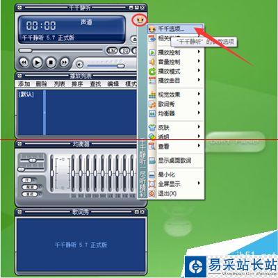 2、單擊千千靜聽軟件右上角的“千千靜聽”圖標(biāo),選擇“千千選項(xiàng)”。