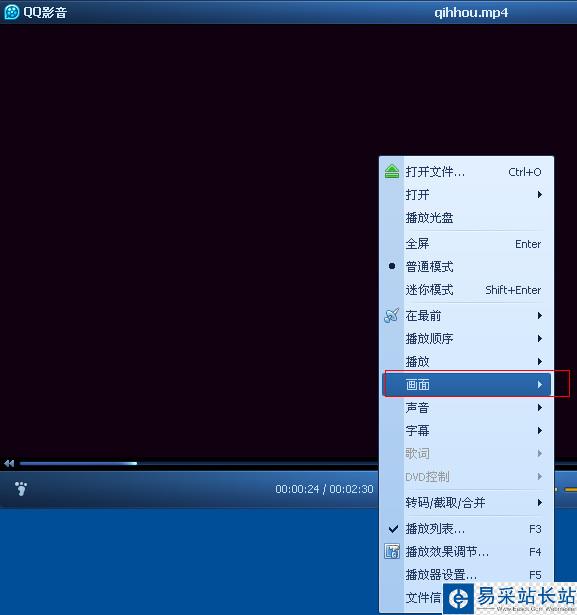 1、用qq影音打開視頻,鼠標移動到視頻畫面上方,點擊鼠標右鍵,選擇【畫面】