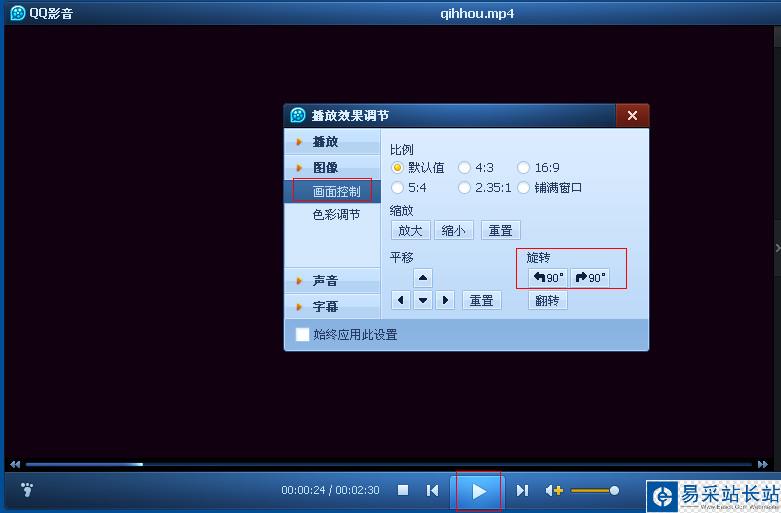 2、點擊【畫面控制】選項,會出現旋轉視頻畫面的各種參數