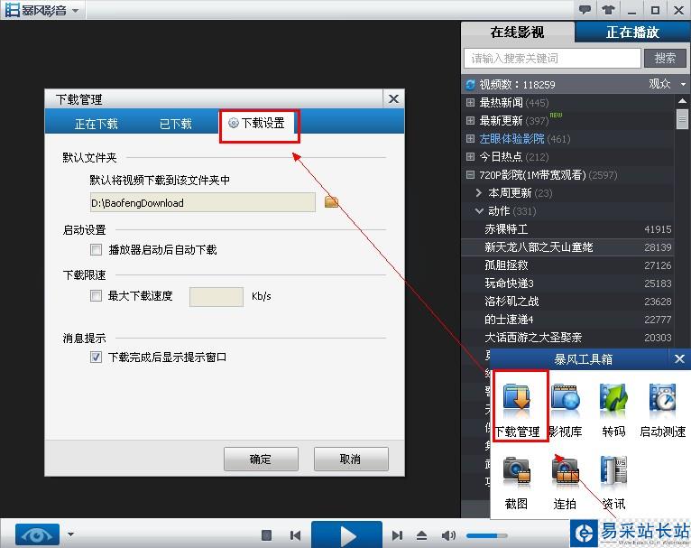 2、如果您想設(shè)置下載路徑,可以打開右下角暴風(fēng)工具箱中的下載管理,進(jìn)行相關(guān)設(shè)置;