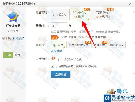 1、點擊開通,選擇3個月的套餐。可以用Q幣、財付通等支付。如下圖: