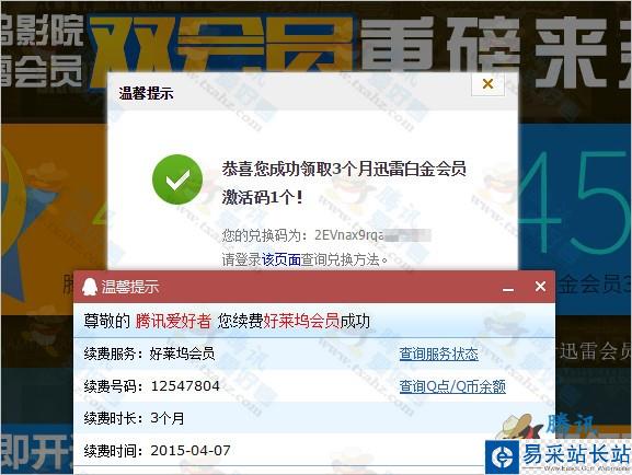 2、開通后,好萊塢會員和迅雷白金會員激活碼秒到賬。如下圖:
