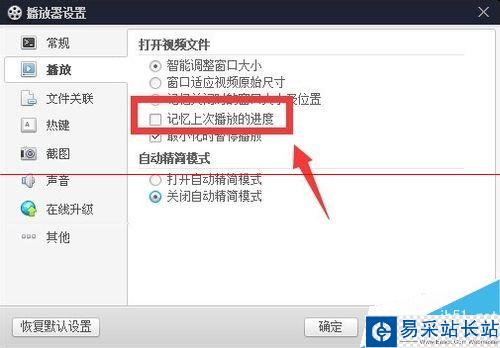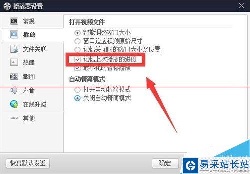 1.4在“播放”設置選項卡,找到“記憶上次播放的進度”選項,并將前面對號點上。