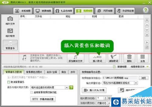 制作聲色并茂的視頻相冊,離不開動聽的背景音樂。 點擊“添加媒體文件”按鈕,導(dǎo)入音樂或MV視頻。點擊“插入歌詞”按鈕,導(dǎo)入相匹配的LRC歌詞文件,制作類似明星MV視頻的效果。