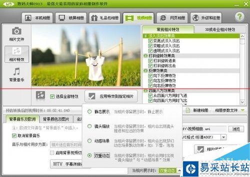 為了方便用戶,軟件智能渲染相片轉(zhuǎn)場特效。當然,如果你想自己設(shè)置酷炫特效,那也只需點擊“應(yīng)用特效到指定相片”按鈕,為制作的視頻相冊一鍵設(shè)置。在“當相片展示時”的彈出框中,選擇“動感場景”或“雙重動態(tài)”特效,還可以為視頻相冊添加花瓣紛紛、蒲公英、浪漫雨天、夏日螢火蟲等如夢如幻的唯美場景特效,制作浪漫的視頻相冊。