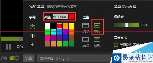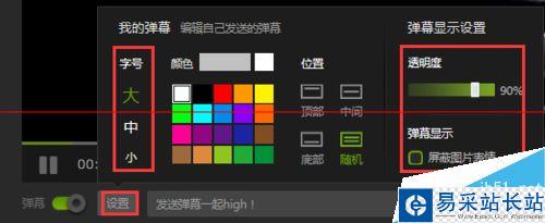 4、點擊彈幕功能里的【設置】按鈕,可以設置字號,顏色,顯示位置,透明度,是否顯示圖片表情等信息,如下圖所示。