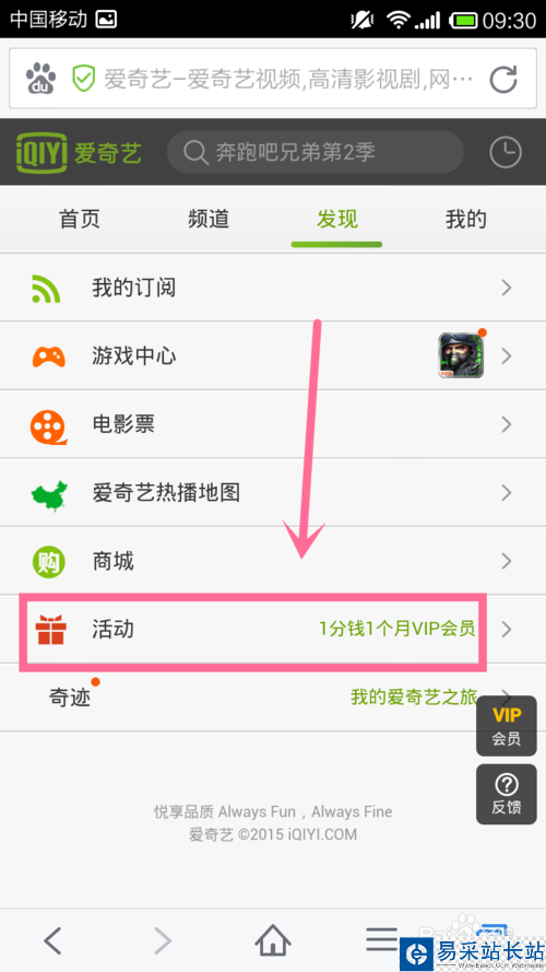 2、進入手機百度瀏覽器主頁-點擊愛奇藝窗口-再點擊發現-點擊下面的活動,這時你就能發現愛奇藝的會員贈送了(我這幅圖的這期活動是要花一分的,有時候是不用的)