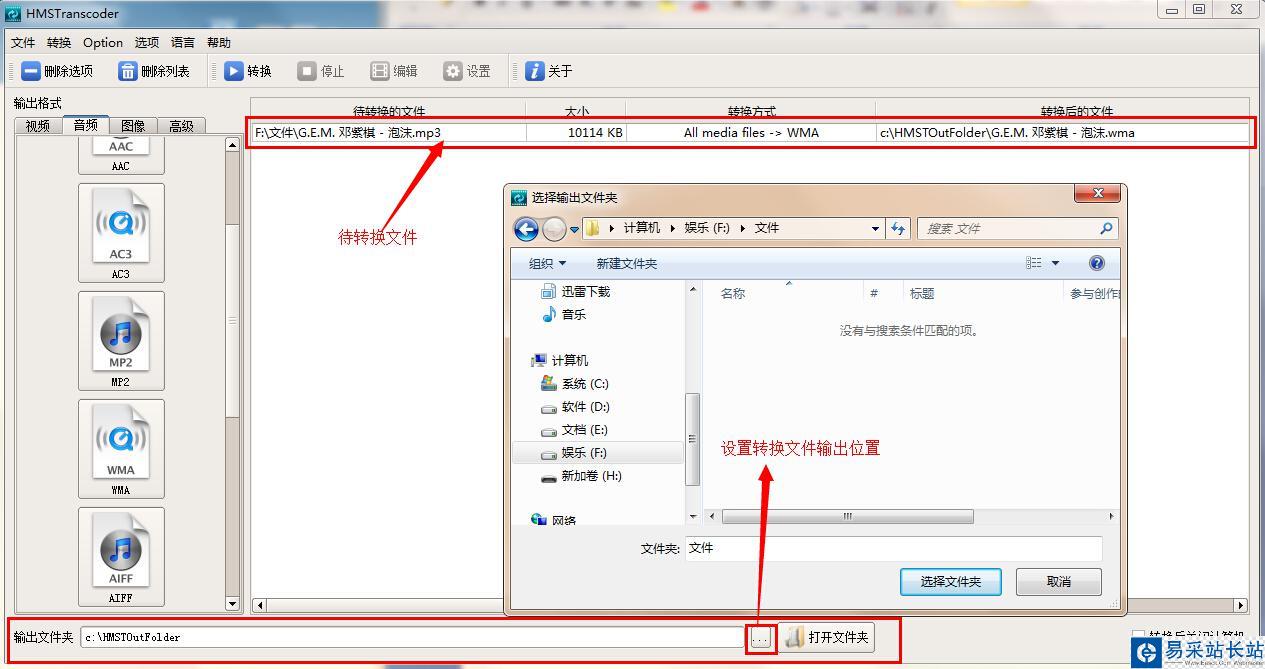 步驟3:需要轉換的文件添加完成后,就需要設置文件轉換的輸出目錄了,點擊主界面最下面的輸出文件夾選項,在這里你可以設置轉換后文件在電腦上的任何硬盤或者桌面上存放,如下圖: