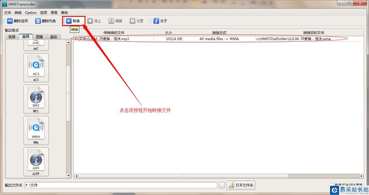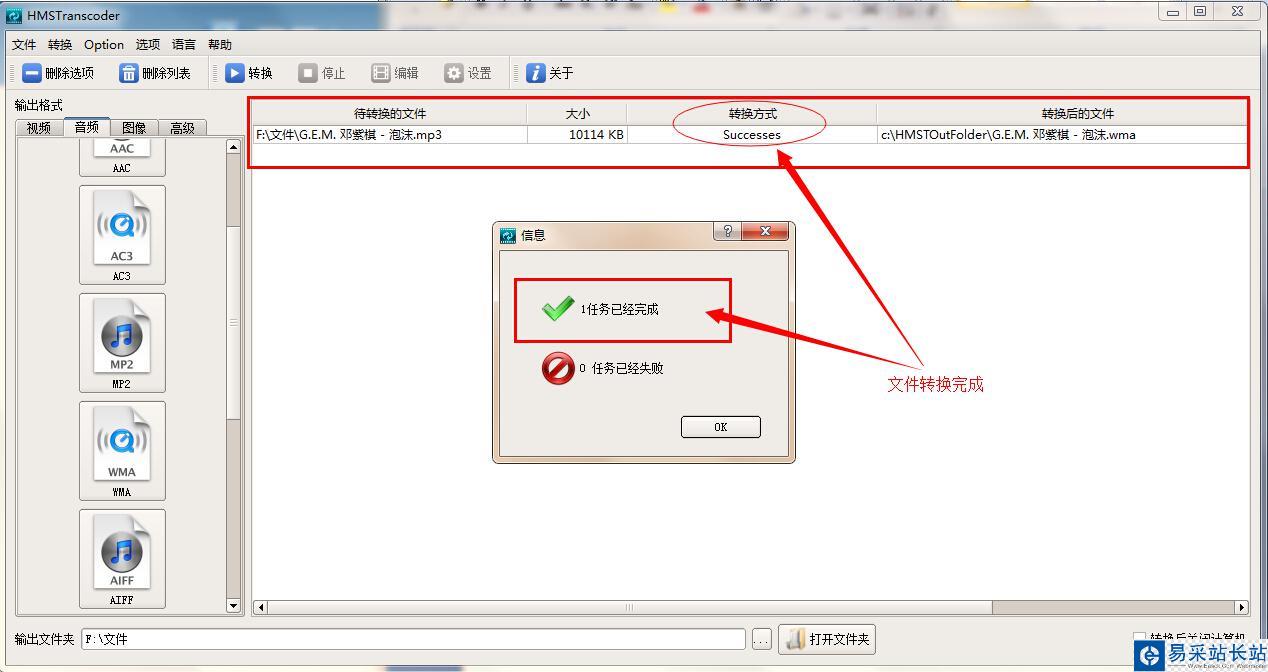 步驟5:幾秒鐘之后,MP3文件就順利轉換成了WMA文件,大家可以看到相應的轉換成功提示。這時你就可以對轉換成功后的WMA文件進行欣賞了。