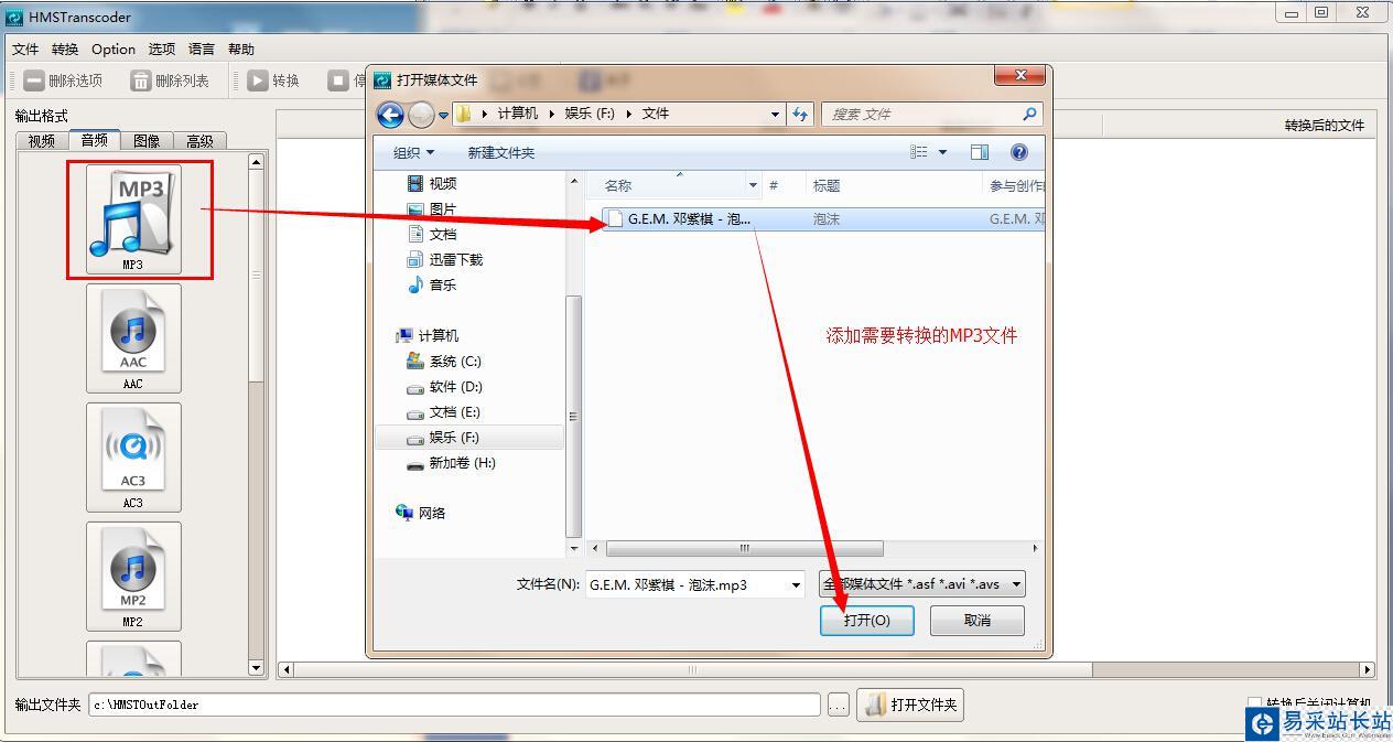 步驟2:點擊輸出格式中的“音頻”按鈕,再在顯示的輸出格式中選擇需要的格式,點擊后會出來一個窗口,在打開的窗口中找到需要轉換的文件,并將其添加到軟件中。