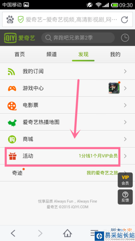 2、進入手機百度瀏覽器主頁-點擊愛奇藝窗口-再點擊發現-點擊下面的活動,這時你就能發現愛奇藝的會員贈送了(我這幅圖的這期活動是要花一分的,有時候是不用的)