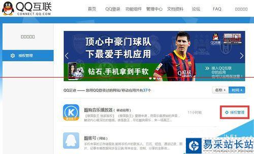 2、此時將打開“qq互聯”界面,切換到“授權管理”選項卡,點擊“酷狗音樂播放器”右側的“授權管理”按鈕。