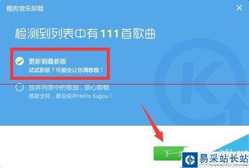 5、當以上方法無法解決QQ登陸酷狗音樂的問題時,我們可以將酷狗更新到最新版本來嘗試解決。進入酷狗安裝目錄,雙擊“uninst.exe”程序,并從彈出的窗口中點擊“更新到最新版”項,點擊“下一步”以下載最新版本酷狗音樂程序。