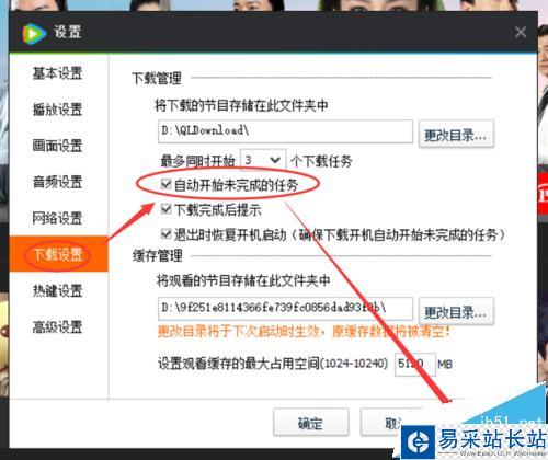 3、在【設置】界面下,點擊選擇【下載設置】--勾選【自動開始未完成的任務】--【應用】選項完成設置。(如圖所示)
