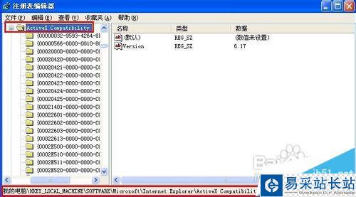 6、打開“注冊表編輯器”窗口,在左側注冊表樹窗口依次展開以下分支:HKEY_LOCAL_MACHINE/SOFTWARE/Microsoft/Internet Explorer/ActiveX Compatibility