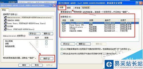 9、單擊“高級”按鈕,進入“高級安全設置”對話框,在“權限”選項卡下的權限項目框中刪除掉類型為“拒絕”的項目,然后再去刪除項就不會出錯了